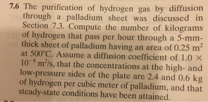 The mathematical expression to calculate the mass (m) of hydrogen gas in the given case is represented as follows: The purification of hydrogen gas is possible by diffusion through a thin palladium sheet.